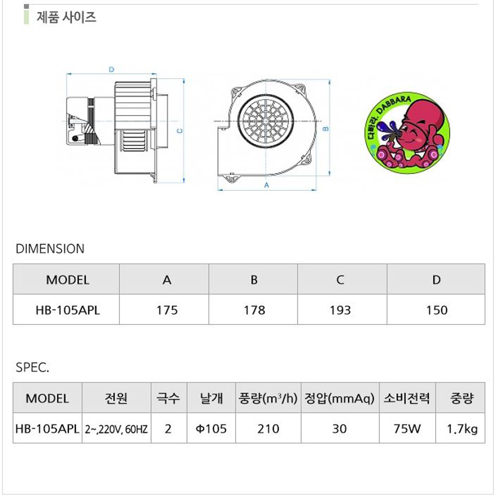 자동차/용품/공구>원예/예초/건설장비>윈치/리프트/송풍기>송풍기/배풍기, 요약정보 : 송풍기 / 전기식 / 전원:단상220V / 주파수:60Hz / 극수:2P / 소비전력:75W / 풍량:210㎥/h / 무게:1.7kg
