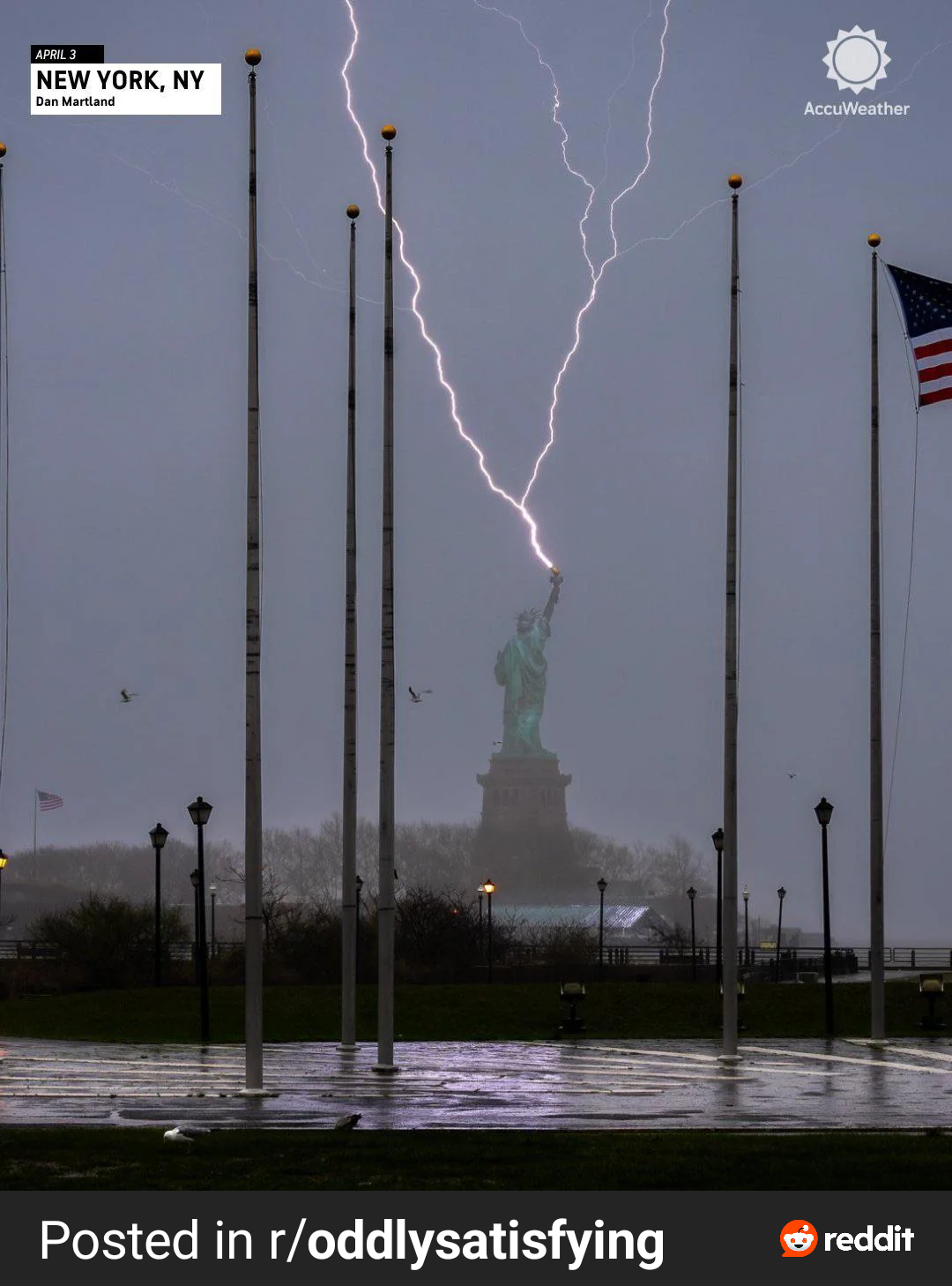 From the oddlysatisfying community on Reddit: Actual photo of the Statue of Liberty getting struck by lightning yesterday