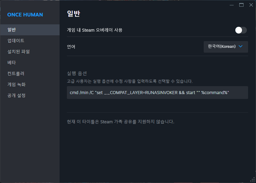cmd /min /C "set __COMPAT_LAYER=RUNASINVOKER && start "" %command%"__COMPAT_LAYER 환경 변수를 설정하여 프로그램이 현재 사용자의 권한으로 실행되도록 강제합니다.